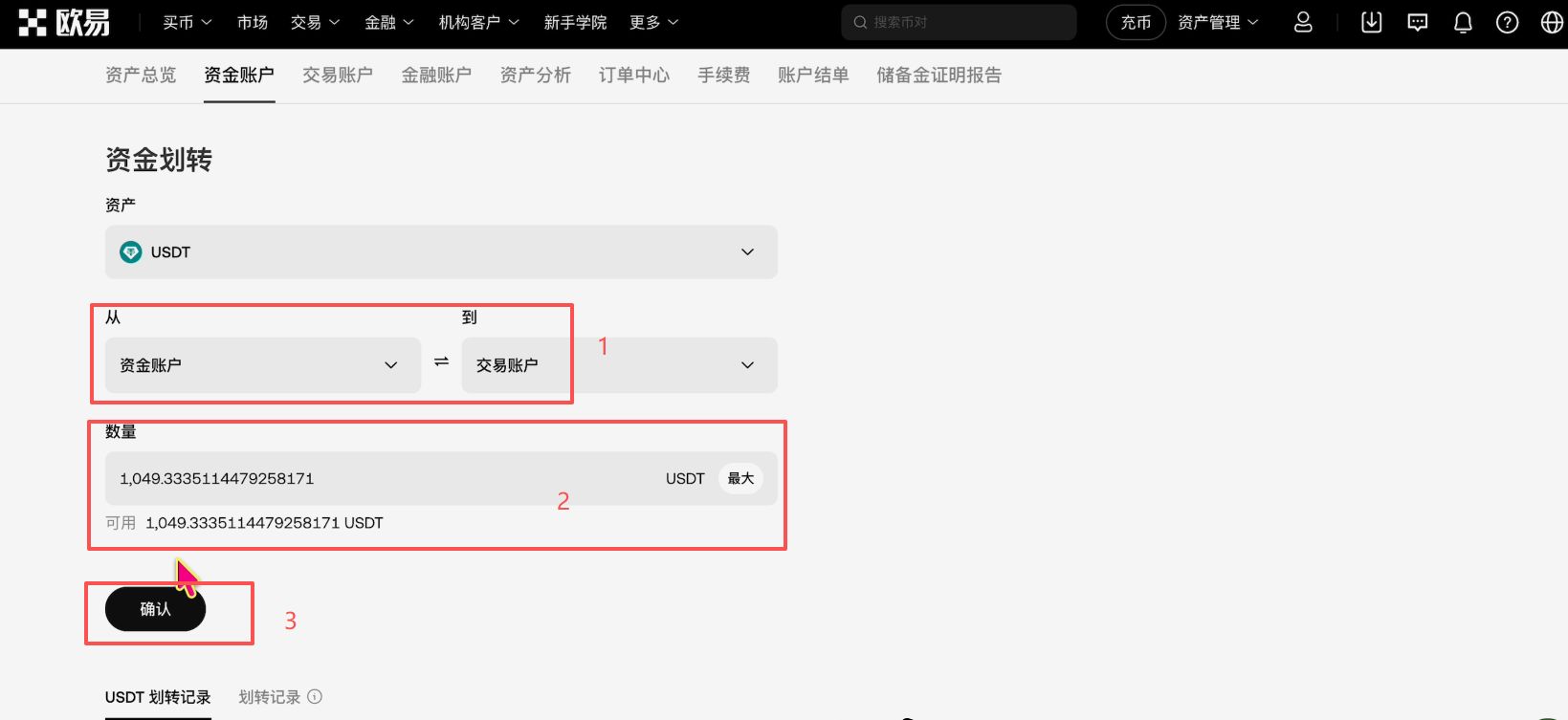 将我们的钱划转到交易账户,全部划转,点击【确认】。