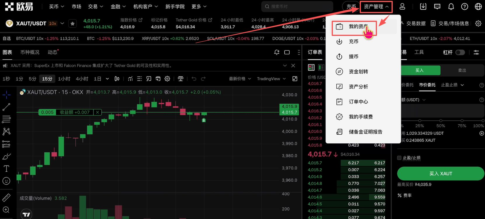 我们买好的USDT都会在资金账户里面,我们点击右上角的【资产管理】,找到【我的资产】。
