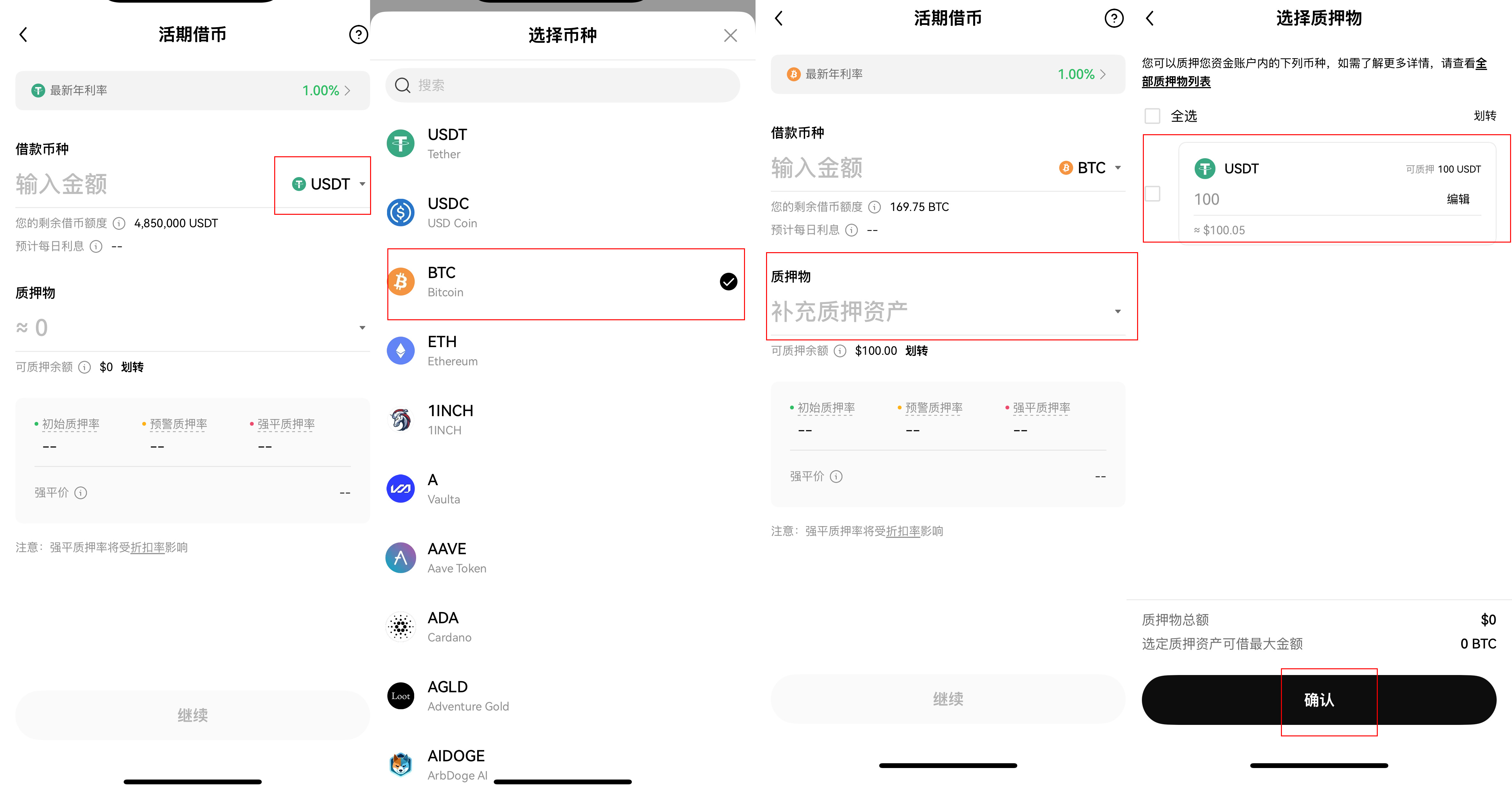 - 勾选USDT 作为质押物后点击确认。 (质押物需要放在资金帐户中)