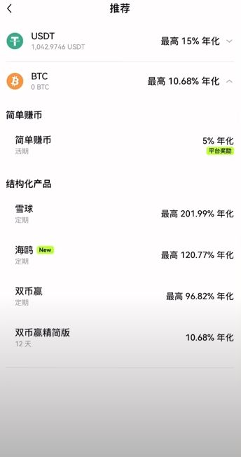 这里有一个BTC的页面我们点击进去。点击【简单赚币】,点击【最大】,把我的BTC全都投到里面。在这里它是有限额的,就是说只对你的0.03个比特币有平台的补贴是年化5%的收益。我现在的金额肯定是没到,那我就直接申购就好了,这就完成了。