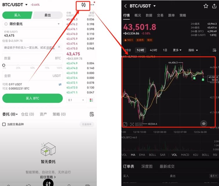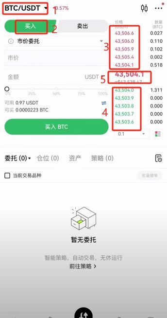 进入到用USDT买比特币的页面。点击【买入】,对应这右边的这些报价,上面红色的是卖出的价格,底下绿色的就是买入的价格。中间的红色大字就是实时的成交价,也就是比特币的报价。