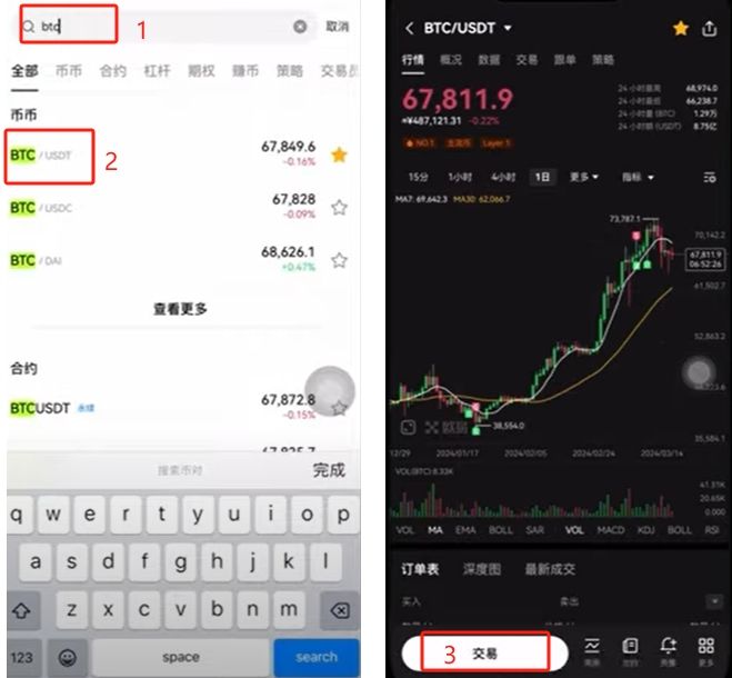 我们想买比特币就可以回到首页,在上方直接搜索“BTC”,这里给我们显示出的第一个“BTC/USDT”就是比特币的现货交易对和USDT的交易对。直接点击选择它。再点击左下角的【交易】。