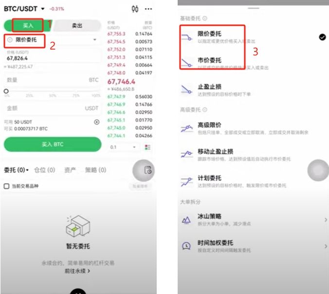 “限价委托”就是你限定一个价格,比如说你可以先定一个6万,等比特币的价格跌到6万之后,它就自动成交。“市价委托”就是以市场最优价来进行购买。这里就用市价委托来给大家做一个演示。