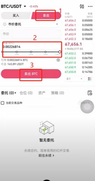 这次我们在上方选择【卖出】,然后我们选择市价委托或者限价委托都可以。这里我们还是选【市价委托】,拉动下方的滑轮到100%,点击【卖出BTC】,这样就卖出成功了。