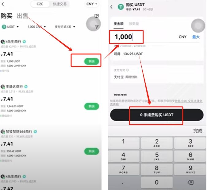 我们一般购买的时候,你也可以试一试快捷买币,也可以选这个C2C交易。“C2C买币”它以前叫做自选区。自选区顾名思义就是有特别多的广告商,他们发布了自己的广告,我们自己来进行挑选。“快捷买币”就是你输入你自己的金额,他自动帮你匹配,哪些卖USDT卖的最便宜的人,它就自动给你匹配上。所以快捷区他只是一个按照价格最优的逻辑进行匹配的。不会单独的看一些商家的订单数和成交量等的这些指标,所以我们一般交易不用快捷买币,都是用C2C买币。