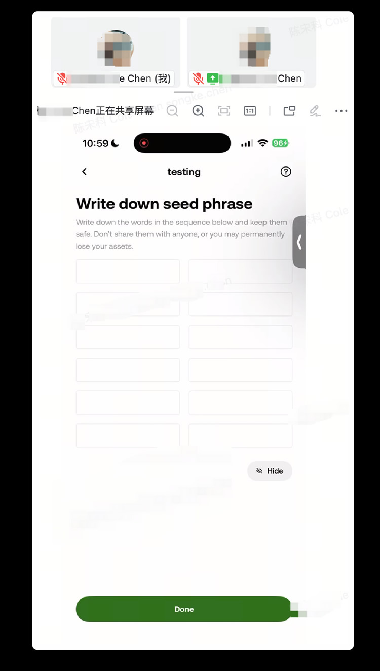 张女士在远程“老师”的指导下,通过视频会议投屏创建钱包。老师一步步演示:下载钱包、生成助记词、充值 Gas、购买代币。整个过程看起来非常“贴心”,最后还提醒她:“私钥一定不要泄漏给任何人。”但她并不知道,在投屏的那一刻,助记词可能已经被记录。两周后,她账户中价值约 $12,000 的 USDT 被转走。