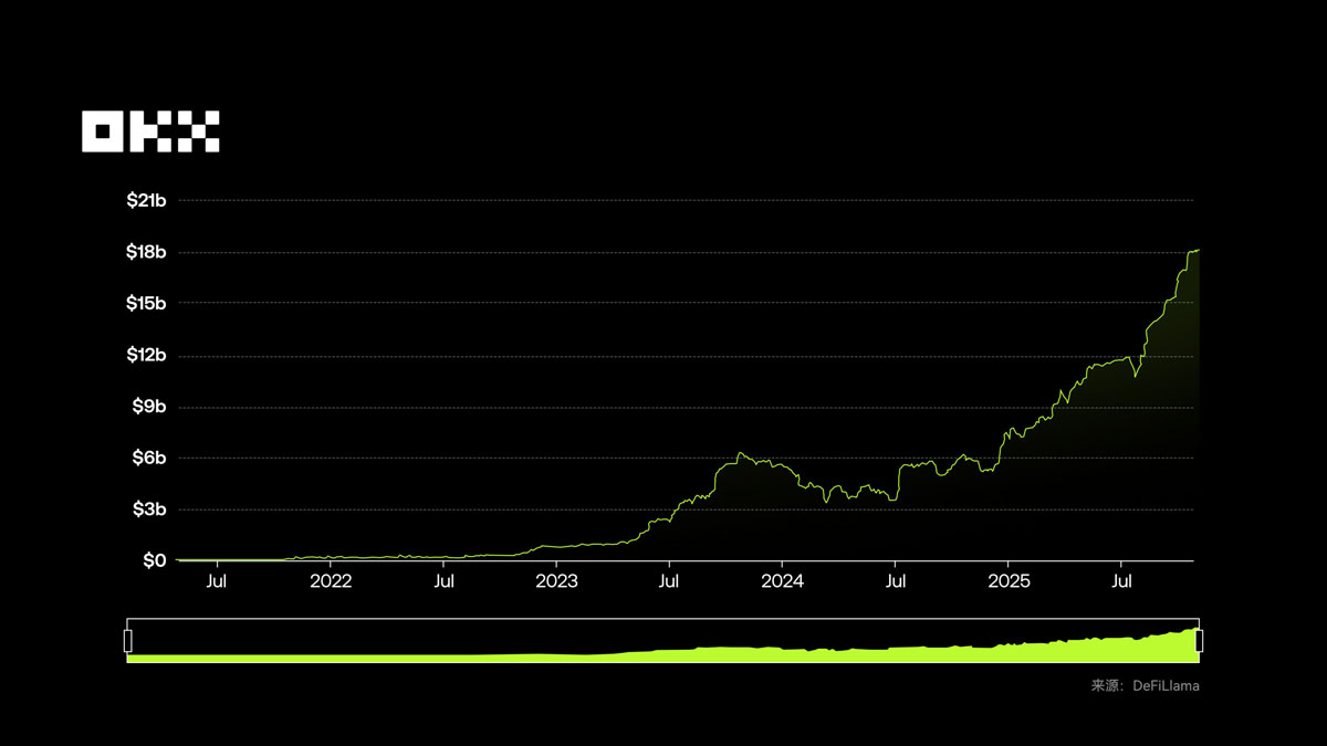 据 DeFiLlama 数据,全球 RWA 总锁仓量 (TVL) 达 181.17 亿美元,延续增长趋势。(注:链上 RWA 总额统计的是所有链上发行的相关代币总价值;而 TVL 特指存放在 DeFi 协议中作为抵押品或生息资产的 RWA 价值。很大一部分 RWA(如贝莱德的 BUIDL)被用户直接持有在钱包里,并未存入 DeFi 协议,因此 TVL 会远小于总发行额。)
