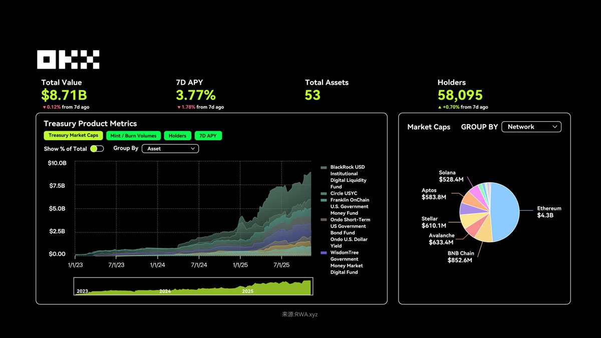 截至 2025 年 11 月 7 日,代币化美国国债市场总锁仓价值约为 87 亿美金,持有者超过 5.8 万人,7 日平均年化收益率(APY)为 3.77%,较前期略微下降,反映利率环境的变化。从链上分布看,Ethereum 占比超过 4.3B 美金,同时多链趋势明显,如 VanEck 的 VBILL 基金扩展至多个生态。
