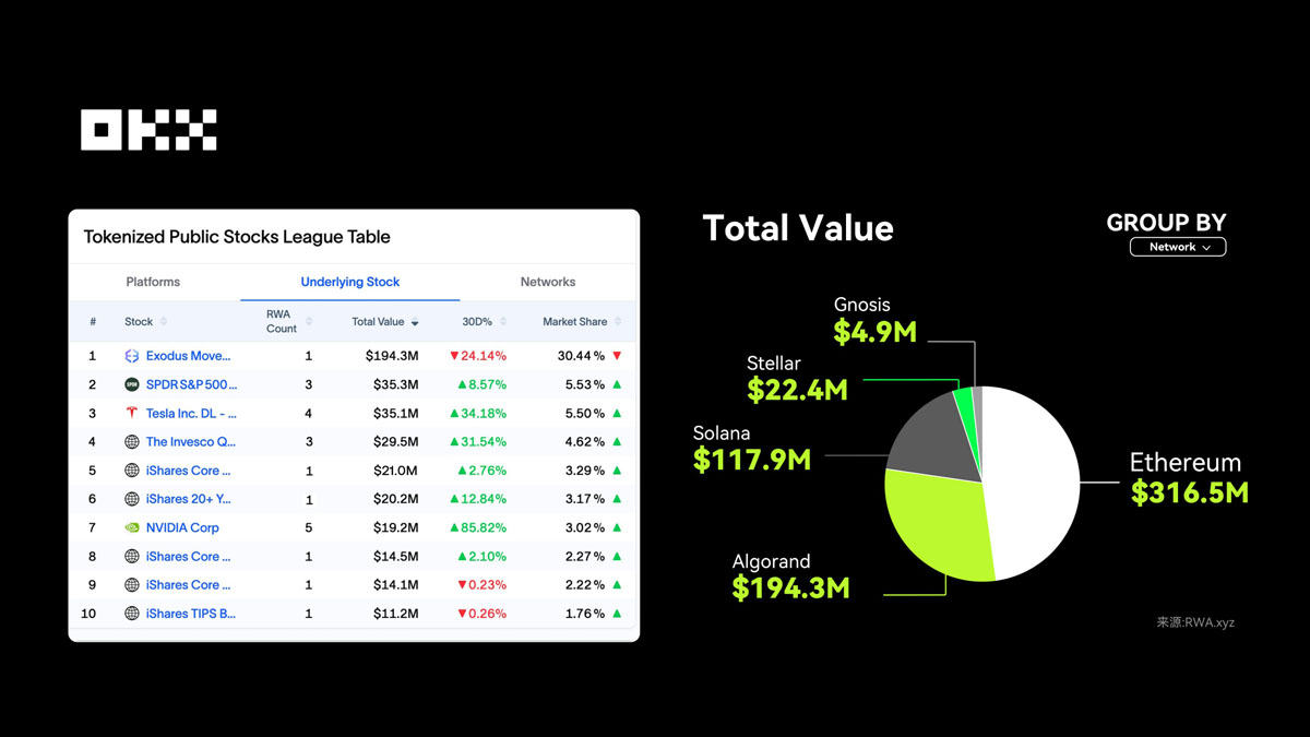 从资产结构上看,目前代币化股票的核心还是科技股和 ETF 产品,市场高度集中在几个头部项目里。比如,Exodus Movement Inc. (EXOD) 以 1.94 亿美元 的总价值稳居第一。2025 年 10 月 20 日,Exodus 宣布通过 Superstate 的发行平台,把普通股代币扩展到 Solana 上(此前主要运行在 Algorand 链),成为「原生链上股票」的代表案例,也说明合规型股权代币化正在从概念走向落地。