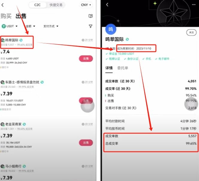 出金的过程你一定在别的文章里看到过,比如说我点击一个人的图标。进去看他的注册时间够不够长,成交率高不高,成交单数多不多,这些确实非常有用。给大家几个标准。首先一个成为商家的时间,最好是大于一年。下边的成交单数和成交总率都是越多越好。