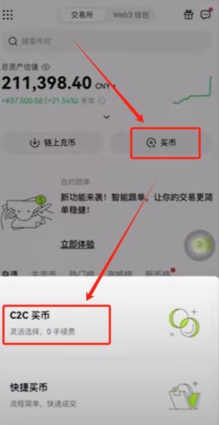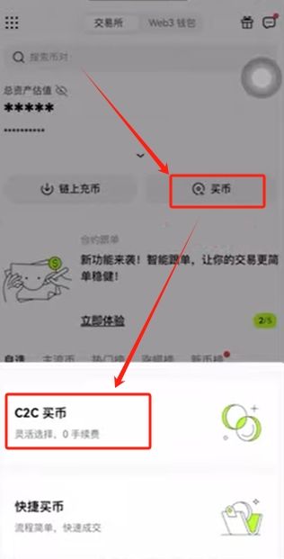 接下来我们点击首页右上角的【买币】按钮,选择【C2C买币】