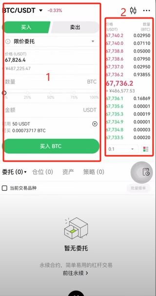 来到交易界面。左边的这一大块是你挂单的设置区域。比如说买入买出之类的。右边的数字就是盘口状态。上方红色的是当前有人卖的价格。下方绿色的是当前有人买的价格。中间红色的大字体就是当前的市价,也就叫市场价。