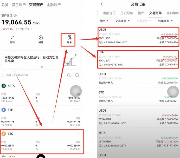 购买成功之后,在交易账户里面可以看到我们购买的比特币。因为这里之前有一点点比特币,所以不确定是不是自己买的。我们可以点击右上角的【账单】来查看交易记录。你刚才购买的比特币是用USDT购买的比特币,花了49.999949个USDT。你能得到的比特币在下方显示+0.00073767个。下边还有手续费、余额他都会一目了然的给你标记出来。