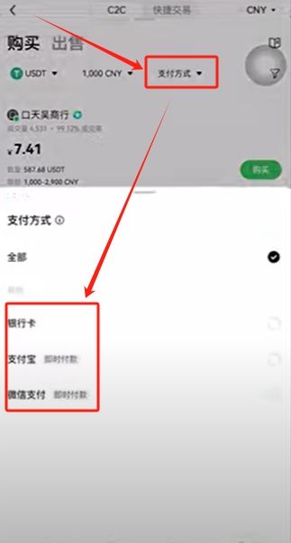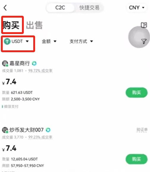 我们一般购买的时候,你也可以试一试快捷买币,也可以选这个C2C交易。“C2C买币”它以前叫做自选区。自选区顾名思义就是有特别多的广告商,他们发布了自己的广告,我们自己来进行挑选。“快捷买币”就是你输入你自己的金额,他自动帮你匹配,哪些卖USDT卖的最便宜的人,它就自动给你匹配上。所以快捷区他只是一个按照价格最优的逻辑进行匹配的。不会单独的看一些商家的订单数和成交量等的这些指标,所以我们一般交易不用快捷买币,都是用C2C买币。