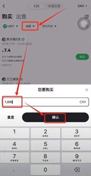 我们继续看上面的功能。点击“金额”,输入一个我们想要购买的金额,比如说我们输入个1000,点击【确定】。他就会帮我们筛选出来支持我们购买1000的这些商家了。