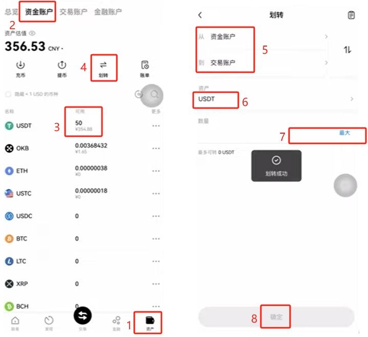 点击【划转】,划转的方向从资金账户划转到交易账户,币种USDT,数量最大,点击【确定】。这样就划转成功了。整个划转过程也是不收取手续费的。大家可以放心的进行划转。