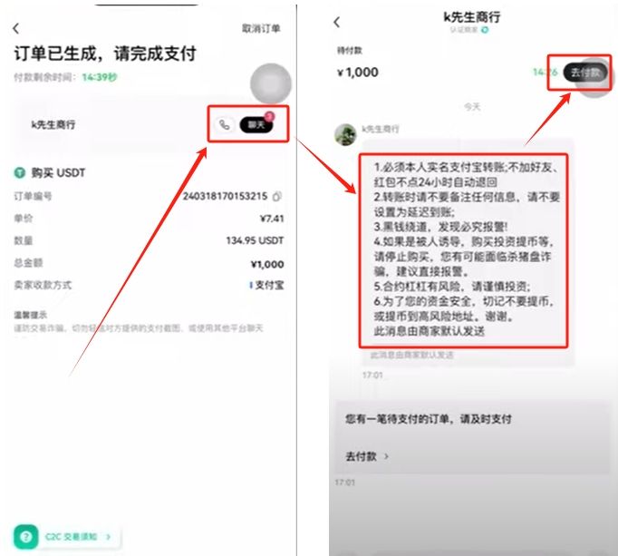 很多人在这一步也会担心给对方转账之后,他收到了我的钱,不给我放USDT怎么办?其实这点大家是不用担心的。因为刚刚我们演示的binanceC2C交易的原理里面已经说了,如果这个币他不放给你,就还是在平台那里压着,并不是在广告方那里压着的。我们就可以拿着支付宝的支付记录去找binance客服进行申诉。就能够把这笔我们应该得到的USDT拿到我们自己的手中。