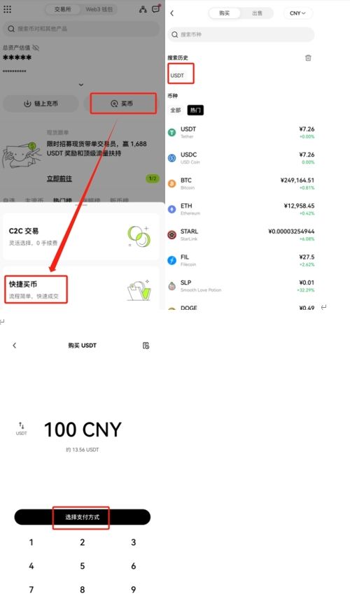 先点击【买币】按钮,有两种购买方式,新手直接点击“快捷买币”,购买的品种是USDT。