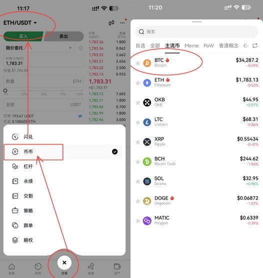 点击下方的【交易】按钮,选择“币币”交易(也就是binance现货交易的意思)。
