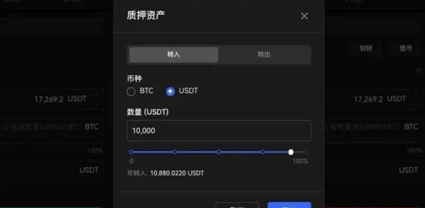 5、在手动模式下,接下来需要确定借币数量。假设需要20,000 USDT来完成交易,并且已从资金账户划转10,000 USDT。在这种情况下,您将借用10,000 USDT并选择“确认”。