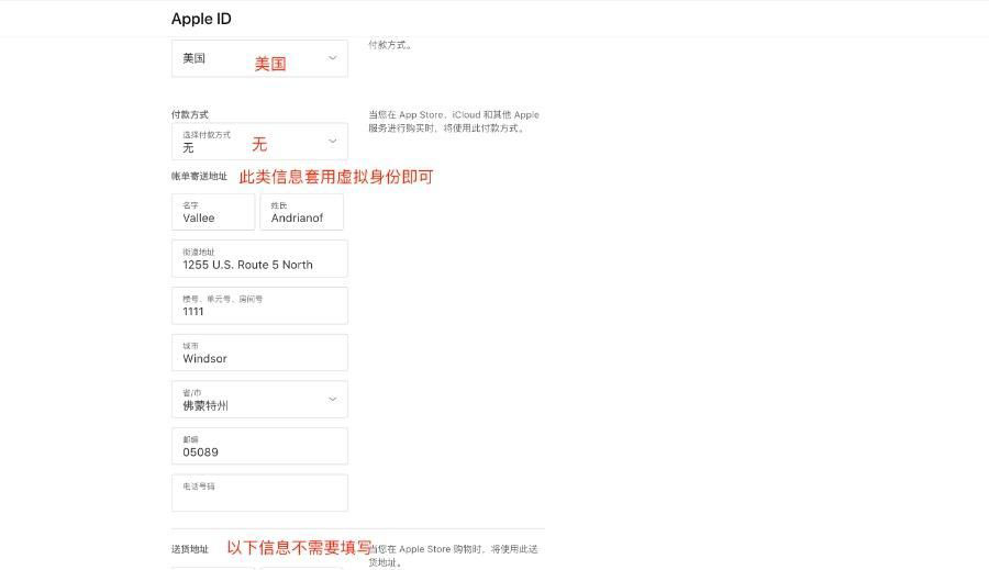 五、按下图所示填写完相关内容,遇到不懂的英文(比如不知道美国各个州的中英文对照),去在线翻译一下可以解决;如果虚拟信息中生成的电话号码格式不对,可重新生成后尝试。