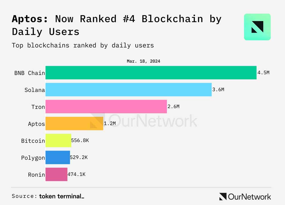 根据 T币安en Terminal 数据,Aptos 以每日 120 万活跃用户排名全球第 4,仅次于 BNB、Solana 与 Tron,显示其不仅有技术,更开始有真实用户规模。