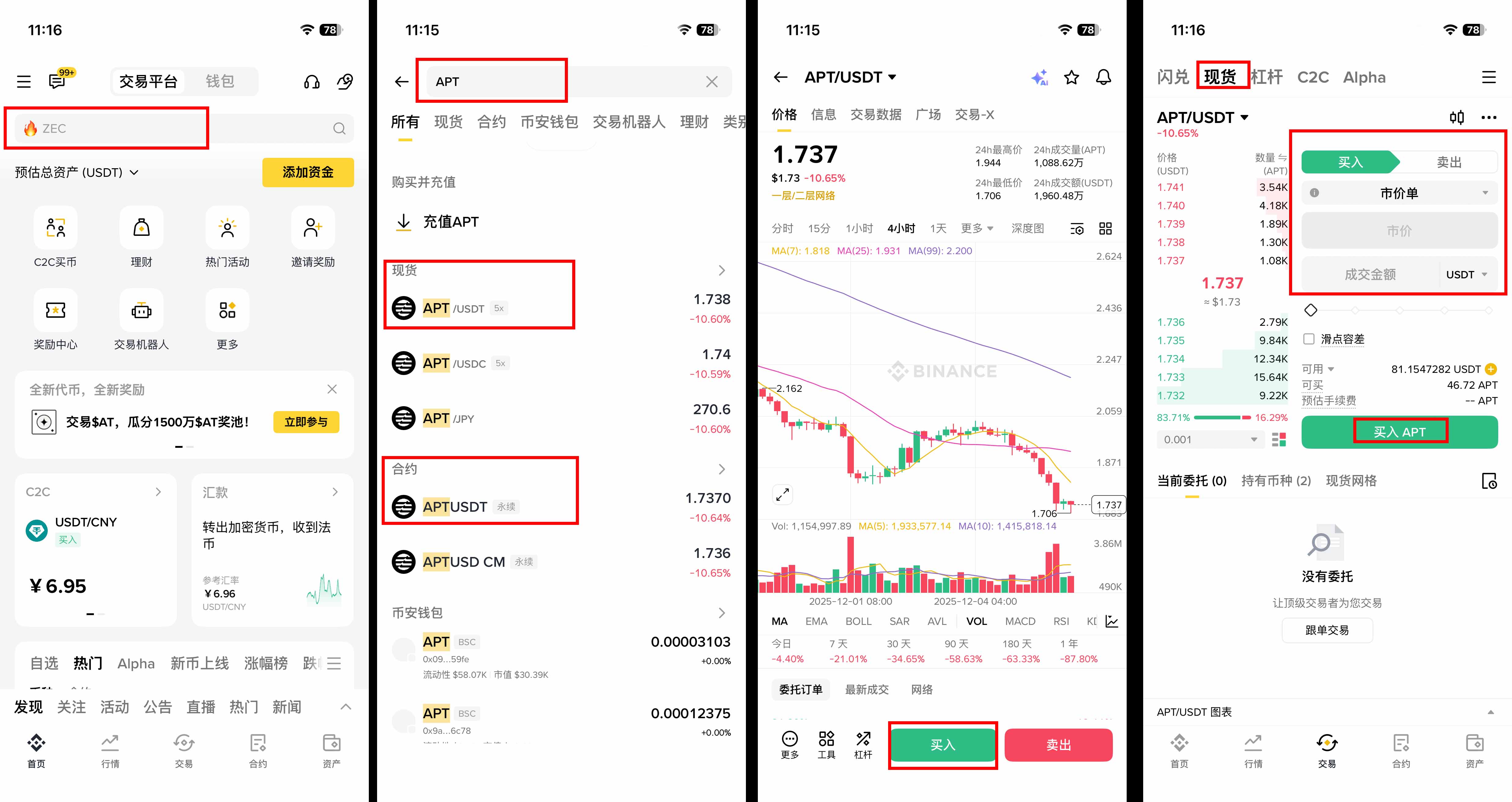 - 打开币安APP,在上方搜寻栏搜寻APT。