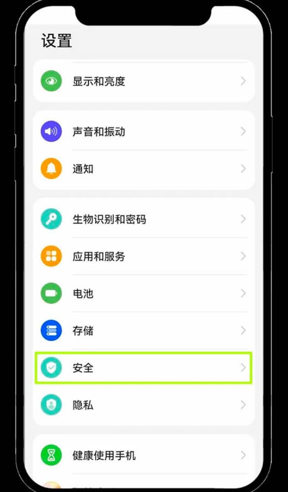 4、返回到主【设置】页面,找到并点击【安全】选项。