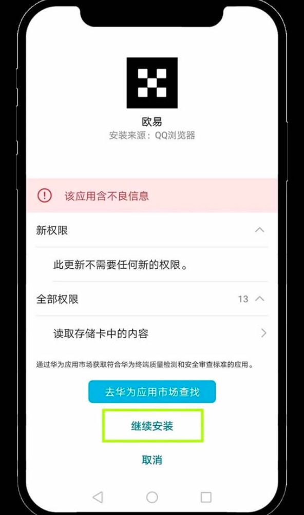 2、系统可能会因为该应用未在华为应用市场上架而进行误报,提示“该应用xxx,请勿安装”。此时,请选择“取消”或“忽略并继续安装”。