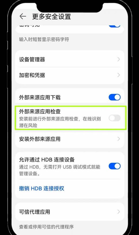 6、将【外部来源应用检查】的开关关闭。完成此操作后,即可返回并正常安装binanceApp。
