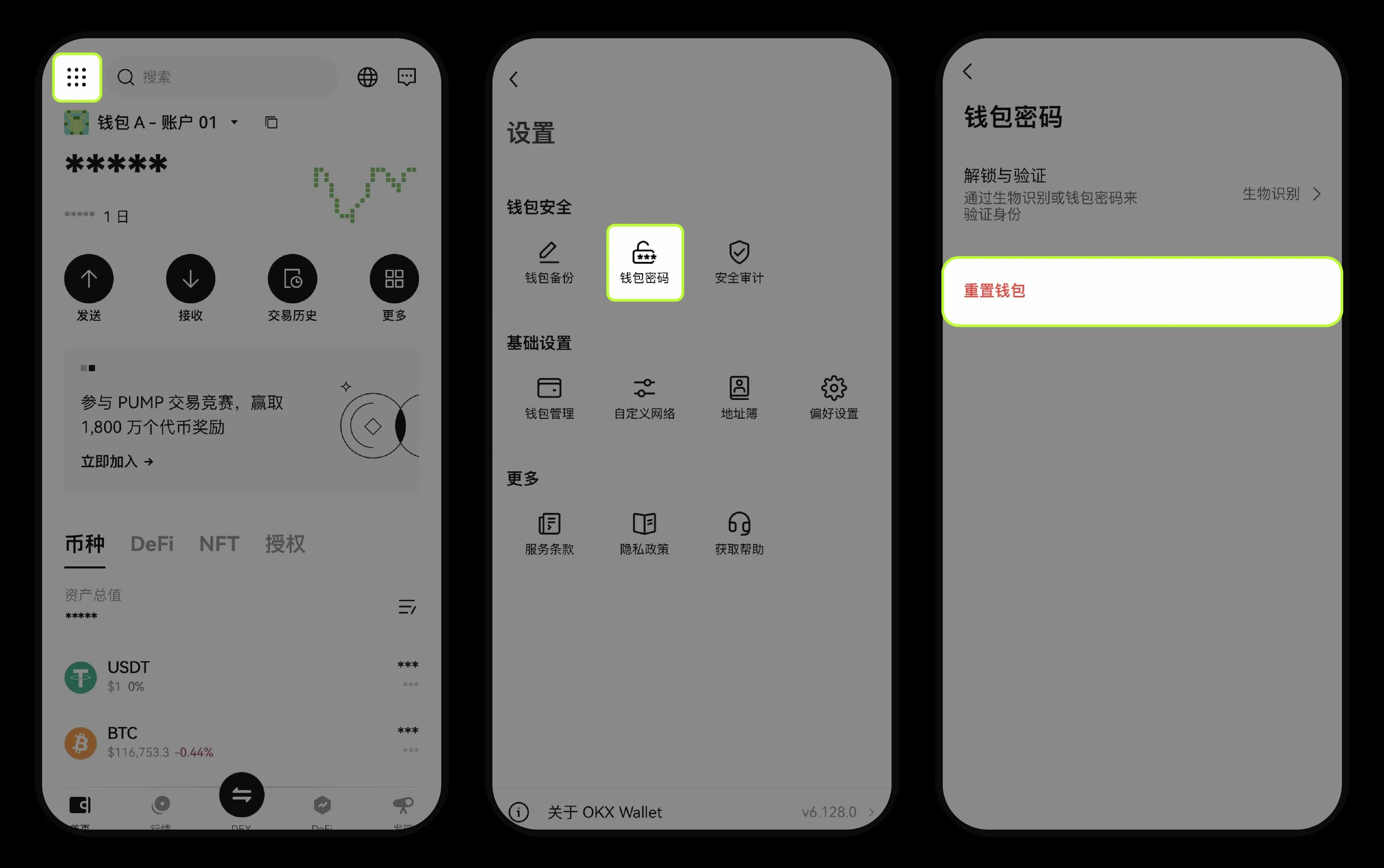 重置钱包意味着将 Web3 钱包恢复到初始状态,它会将助记词、私钥和钱包数据全部清除。重置完成后,您需要重新输入助记词或私钥才能访问钱包。打开 Web3 钱包,点击左上角 【全功能图标】 – 【设置】 – 【钱包密码】 – 【重置钱包】