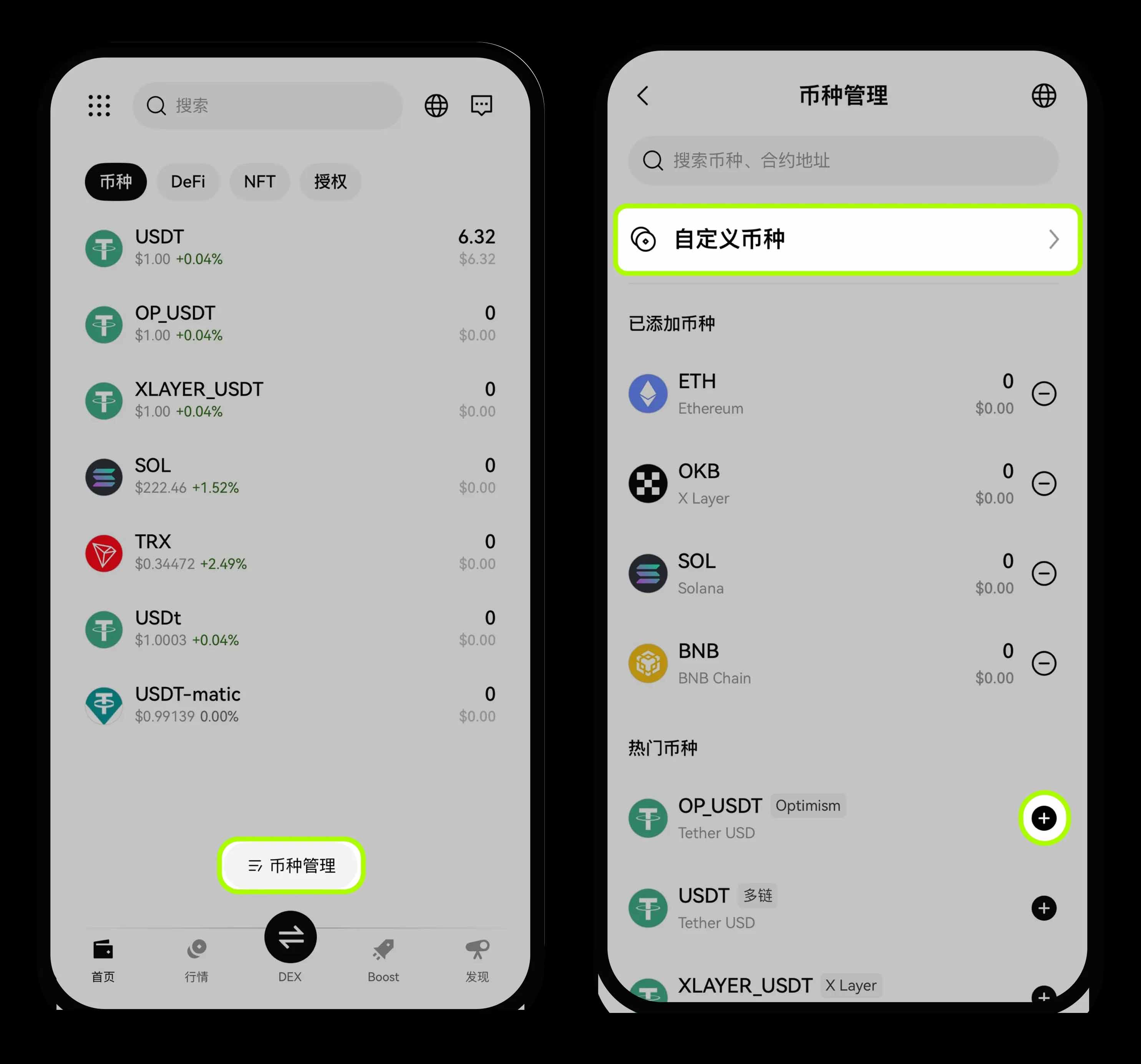 如果要收款的币种不在已添加币种内,在钱包首页,下滑并点击【币种管理】- 搜索币种或合约地址,找到对应币种后,点击【+添加】按钮进行添加。若您搜索不到相关币种,则可点击【自定义币种】选择对应的网络,输入合约地址等信息,点击【确认】完成添加。