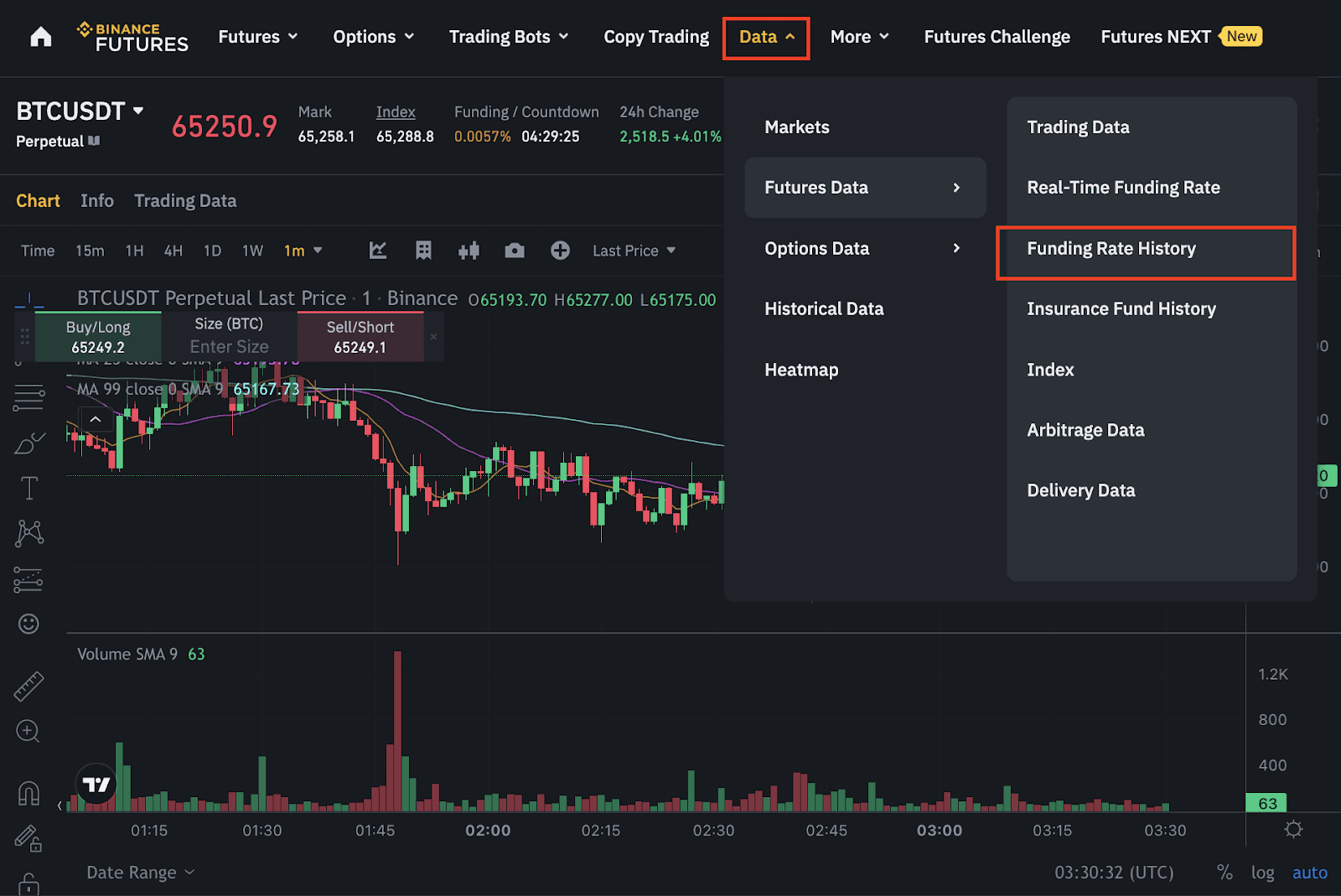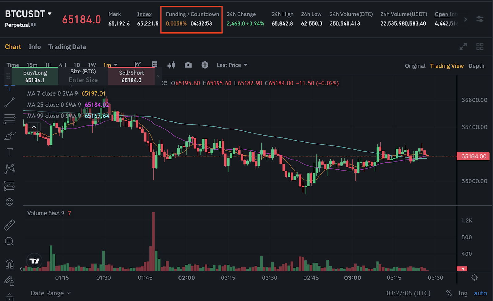 您可以在 K 线图上方的币安合约界面查看资金费率和距离下一次资金费用结算的倒计时: