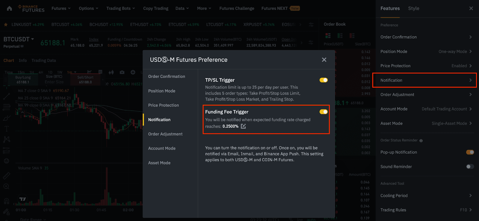 2. 前往【通知设置】选项卡,开启【资金费用触发通知】按钮。您也可以自定义资金费率百分比,将其设置在 0.0001% 至 0.75% 之间。目前预设值为 0.25%,代表您会在预期资金费率达到 0.25% 时收到通知。