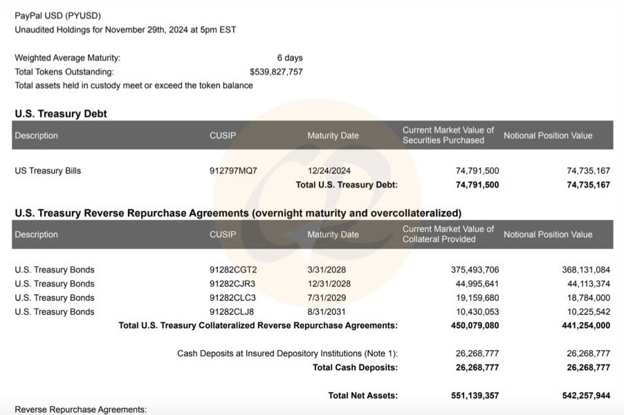 Paxos(PayPal)收到美金后,则会拿来购买美国国债、美国国库券或单纯存款,这三者皆是相对保守的保管方式,借此担保1 PYUSD=1 USD 及因应用户的随时提款。
