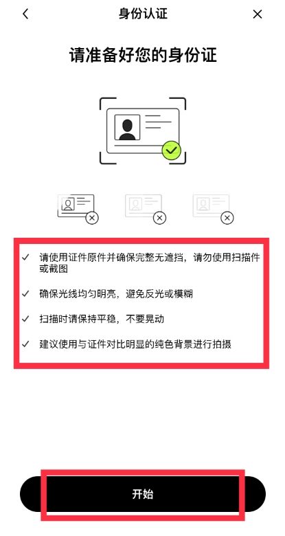 3.仔细阅读下方红框内的证件上传要求,准备好身份证件,点击【开始】按钮。