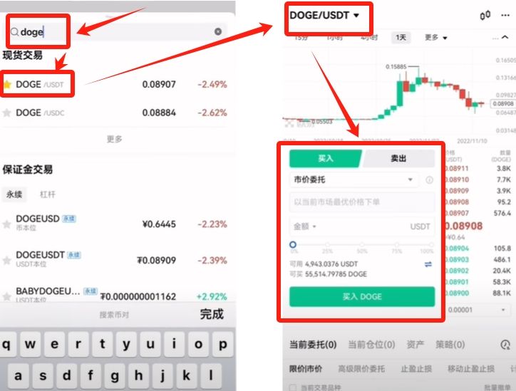 比如说我们买狗狗币,输入doge,选择“DOGE/USDT”,也是直接可以进行买卖的,还是比较方便的。