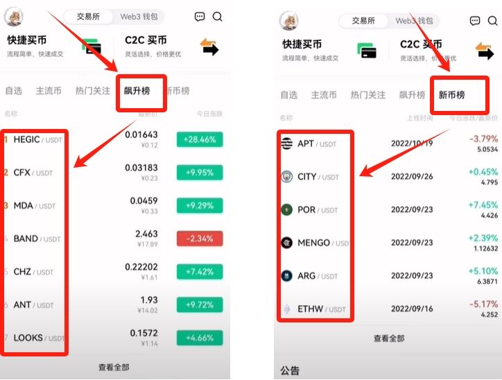 “飙升榜”的意思一般是说他涨幅比较多,比较大的,会进飙升榜的。“新币榜”就是说刚上binance交易所的币,新币一般起伏会比较大一点,这个大家也可以关注。