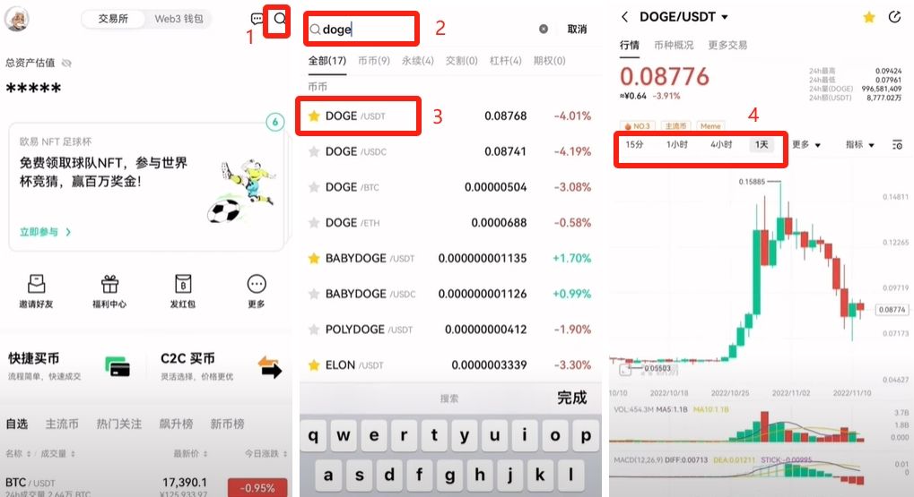 像有些币你可能在这里找不到,比如说你忽然听说一个什么什么币涨得厉害,但你又找不到,怎么办呢?我们点击右上角的放大镜,在这里搜索一下,比如说我们在微博上看到狗狗币说马斯克涨的厉害,那我们直接搜一下“doge”,可以看到会有很多跟狗币关联的交易对,因为我们的钱是在USDT的交易账户里面,所以我们选DOGE/USDT的交易对,点击一下就能够看到他的线了。这里可以看4小时线、一小时线、一天线。