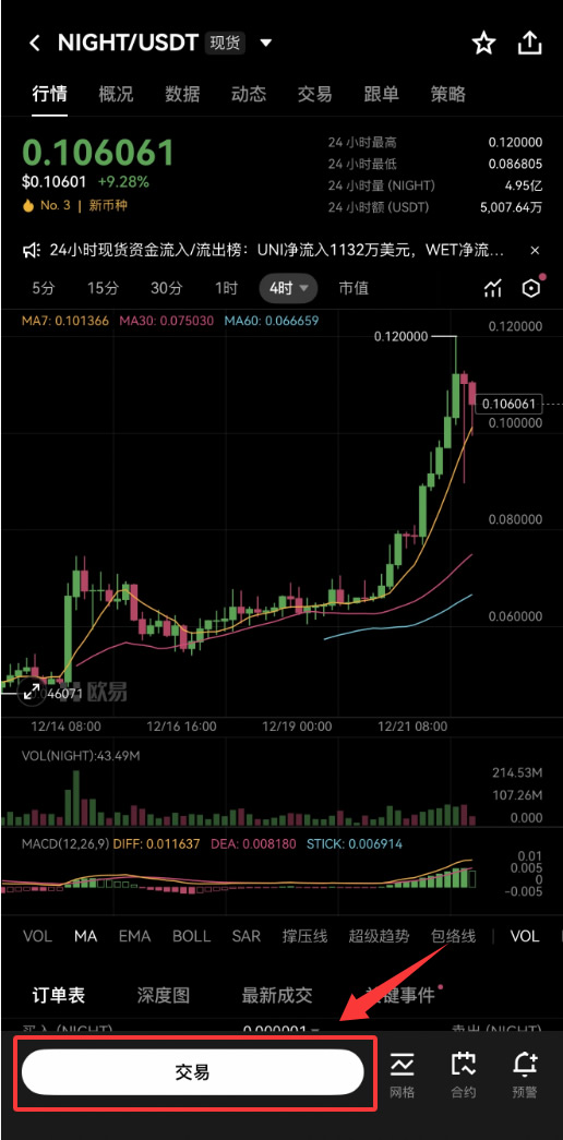输入【NIGHT】,这时下拉会显示很多类型的产品,我们只选择【现货】【NIGHT/ USDT】,点击【NIGHT/ USDT】。(作为新手,不建议做合约或者其他产品,所以这里就不演示合约购买方式了。)