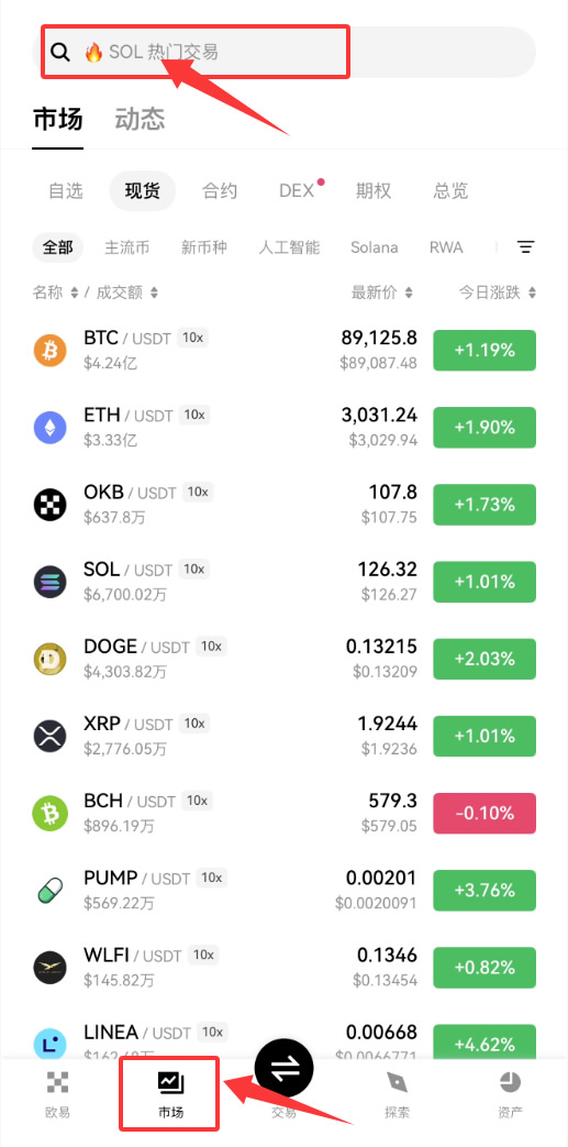 打开binanceapp(官方注册 官方下载),点击【市场】上方的搜索框;