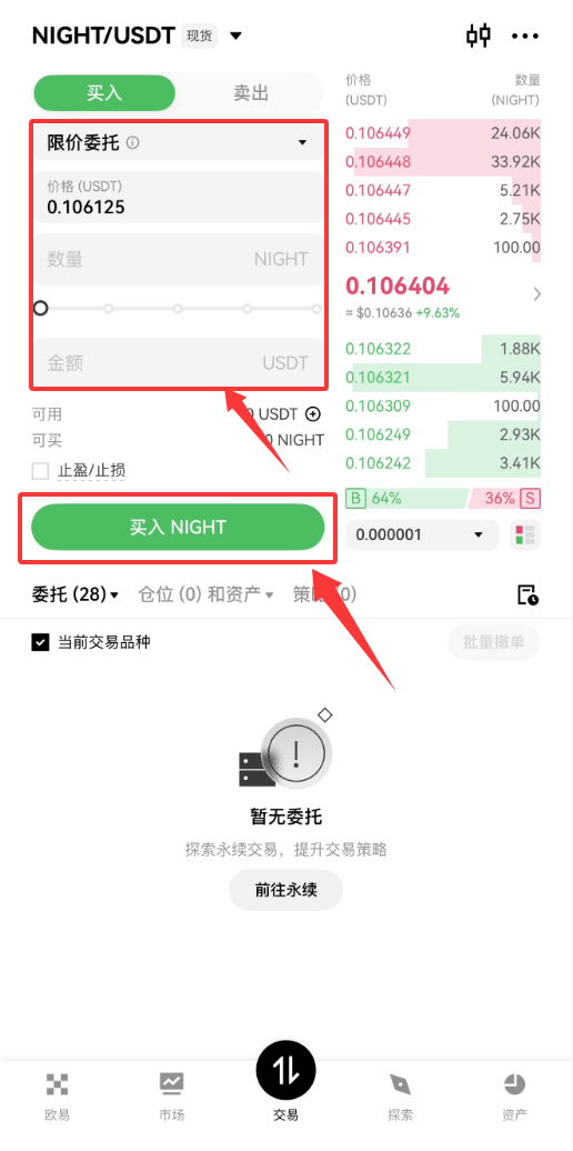 依次选择【限价委托】-购买【价格】-购买【数量】,设置好之后,点击【买入NIGHT】即可。