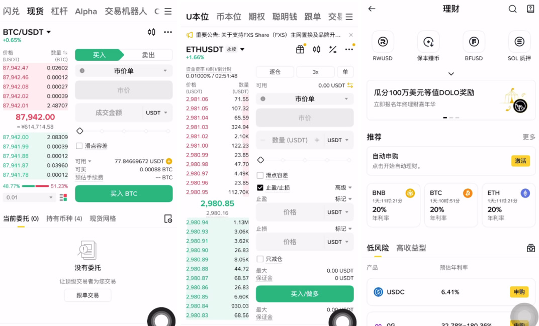 - 拥有庞大的理财(Earn)板块,闲置资金利用率高。