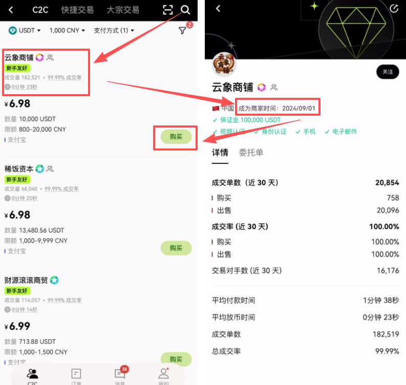 使用这个方法筛选出来的商家,都是高权重的商家,特别适合新手第一单。USDT到手后记得转到交易账户,才能去进行其他交易。