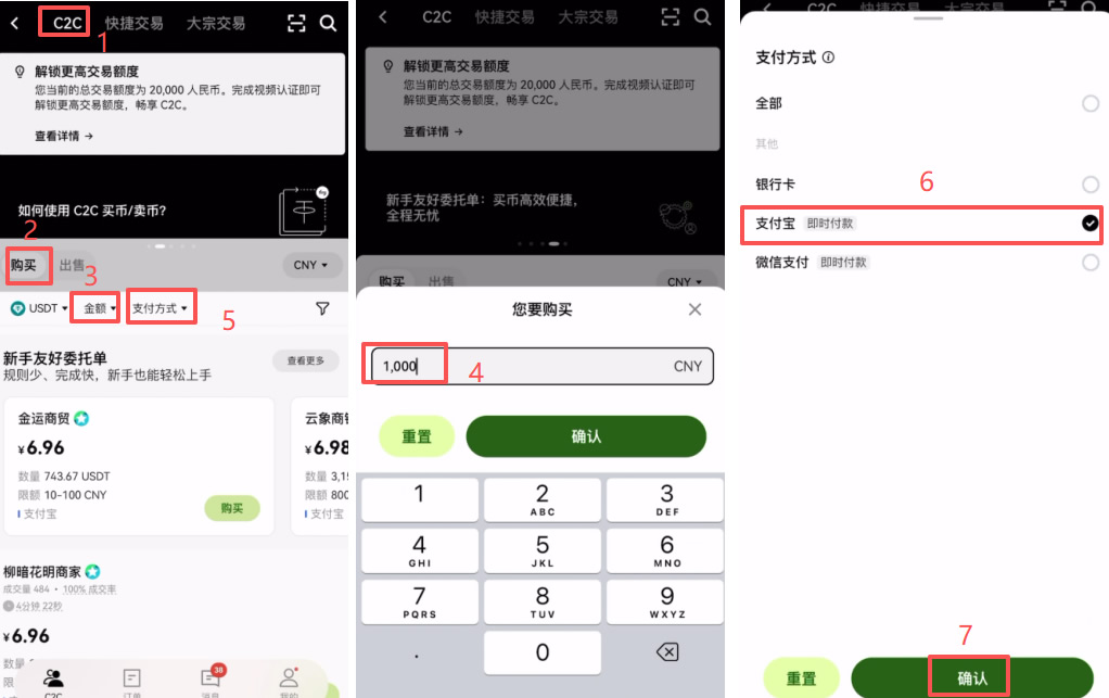 在C2C页面,购买的部分,我们就可以进行入金。首先可以去筛选一下我们想要购买的金额,比如说我这里想购买1000人民币的USDT。支付方式这里,比如说我想用支付宝来进行付款,点击【确认】。