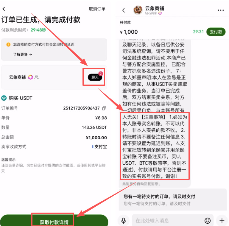 这个时候我们的订单就生成了,可以点击一下【聊天】这里,看一下商家有哪些要求,比如说必须实名付款,不要备注任何信息,不要设置延迟到账,避开敏感词,这些都是一些比较基本的要求了,想要让我们的交易顺利的进行,就必须按照商家的要求去做。接下来我们点击【获取付款详情】。