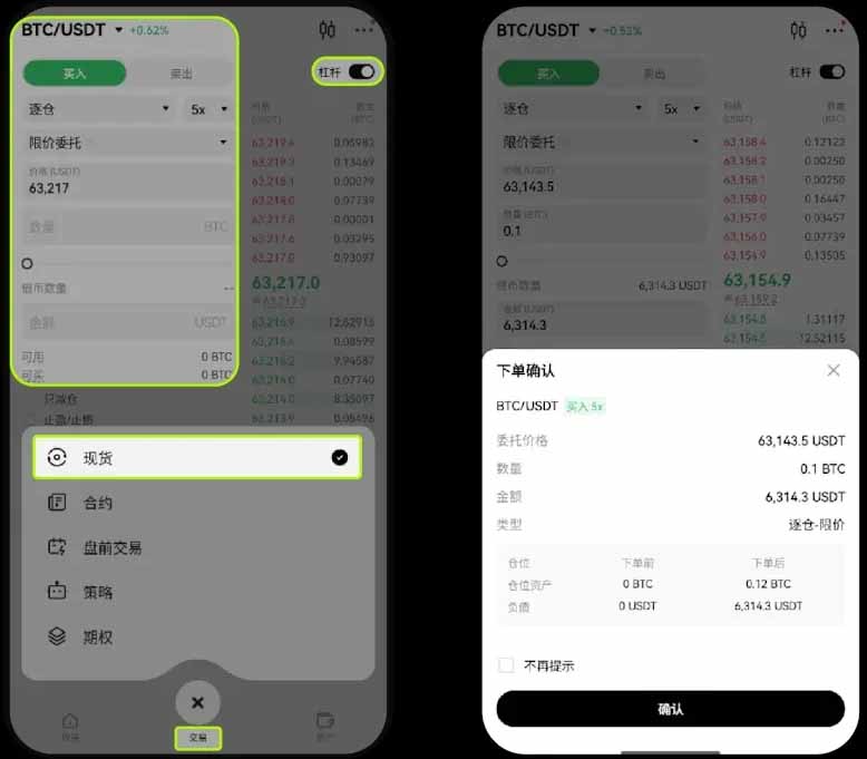 以 BTC/USDT 杠杆交易为例:打开 币安 App【交易】– 选择您要的交易模式 — 打开右上角【杠杆】模式。选择【全仓/逐仓】、【限价委托】、【USDT保证金】、【杠杆倍数】— 输入【价格】、【数量】—点击【卖出BTC】—【确认】。