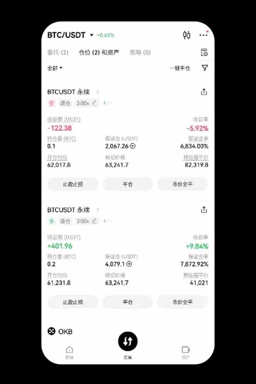 温馨提示:用户也可以选择【止盈止损】的方式来平仓,从而及时止损减少损失,或者及时止盈锁住利润。选择具体要平的仓位点击【止盈止损】 — 输入【止盈触发价格】、【止损触发价格】、【数量】—点击【确定】。如果需要快速平掉全部仓位,可以选择具体仓位,点击【市价全平】。