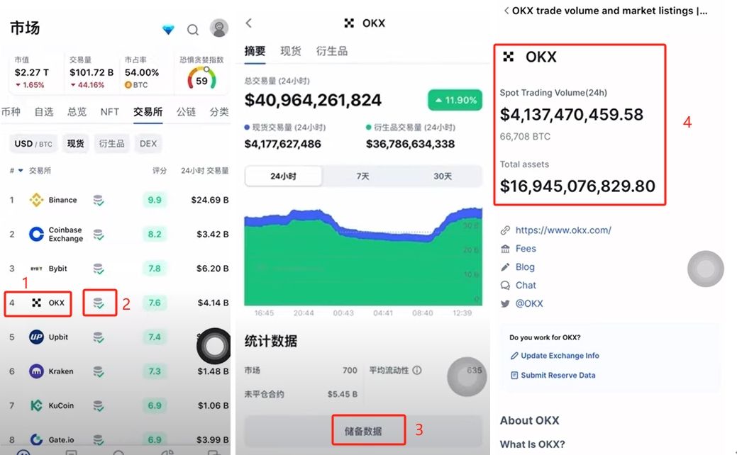 它里面分为几个部分,第一个是他有一个小金币,打对钩样式的LOGO,我们点击一下,可以看到币安的储备数据,点击【储备数据】,储备数据其实就是币安的资产证明,币安通过公布自己的资产证明给外界,就能够让外界知道,他的总共资产一共有这么多。