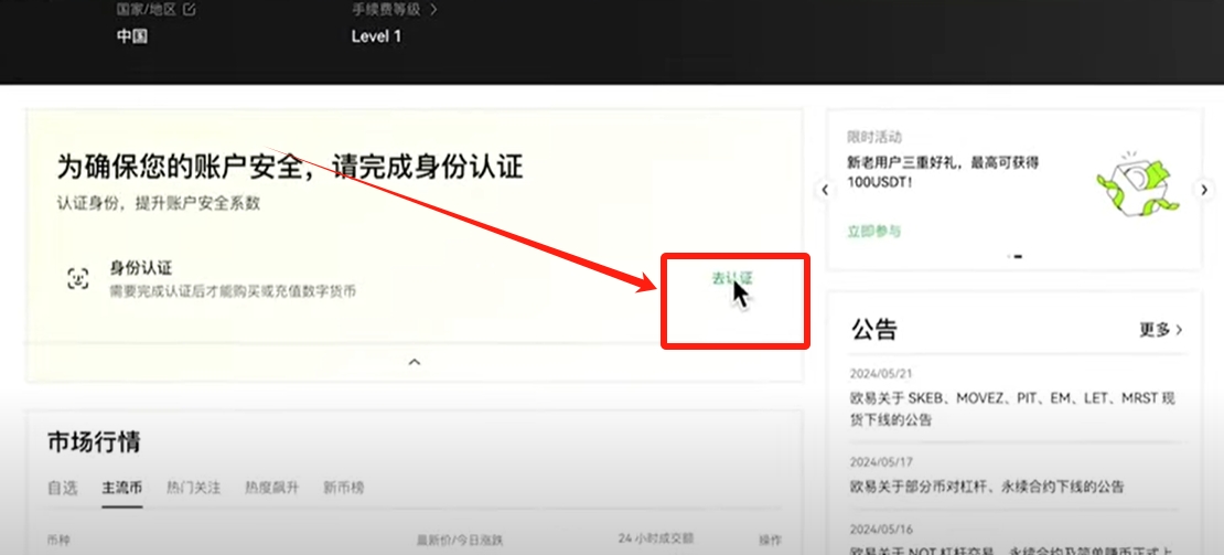 注册好之后,他会要求我们去进行身份认证。我们点击【去认证】。
